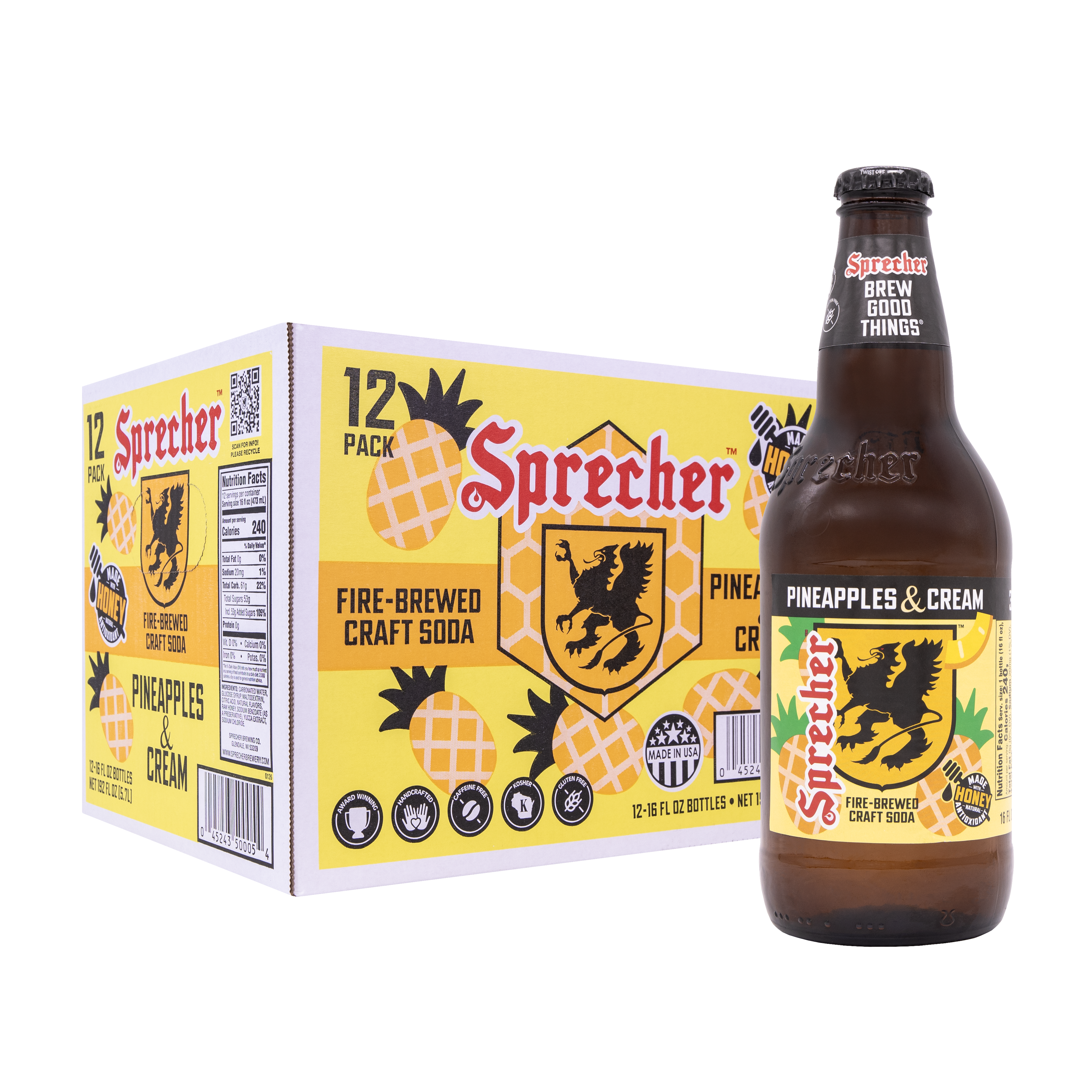 Sprecher Pineapples & Cream Craft Soda brings together bright tropical pineapple flavor and smooth vanilla cream for a rich, refreshing soda experience. Fire brewed in small batches; this craft soda develops a fuller flavor and smooth finish that sets it apart from ordinary soft drinks.