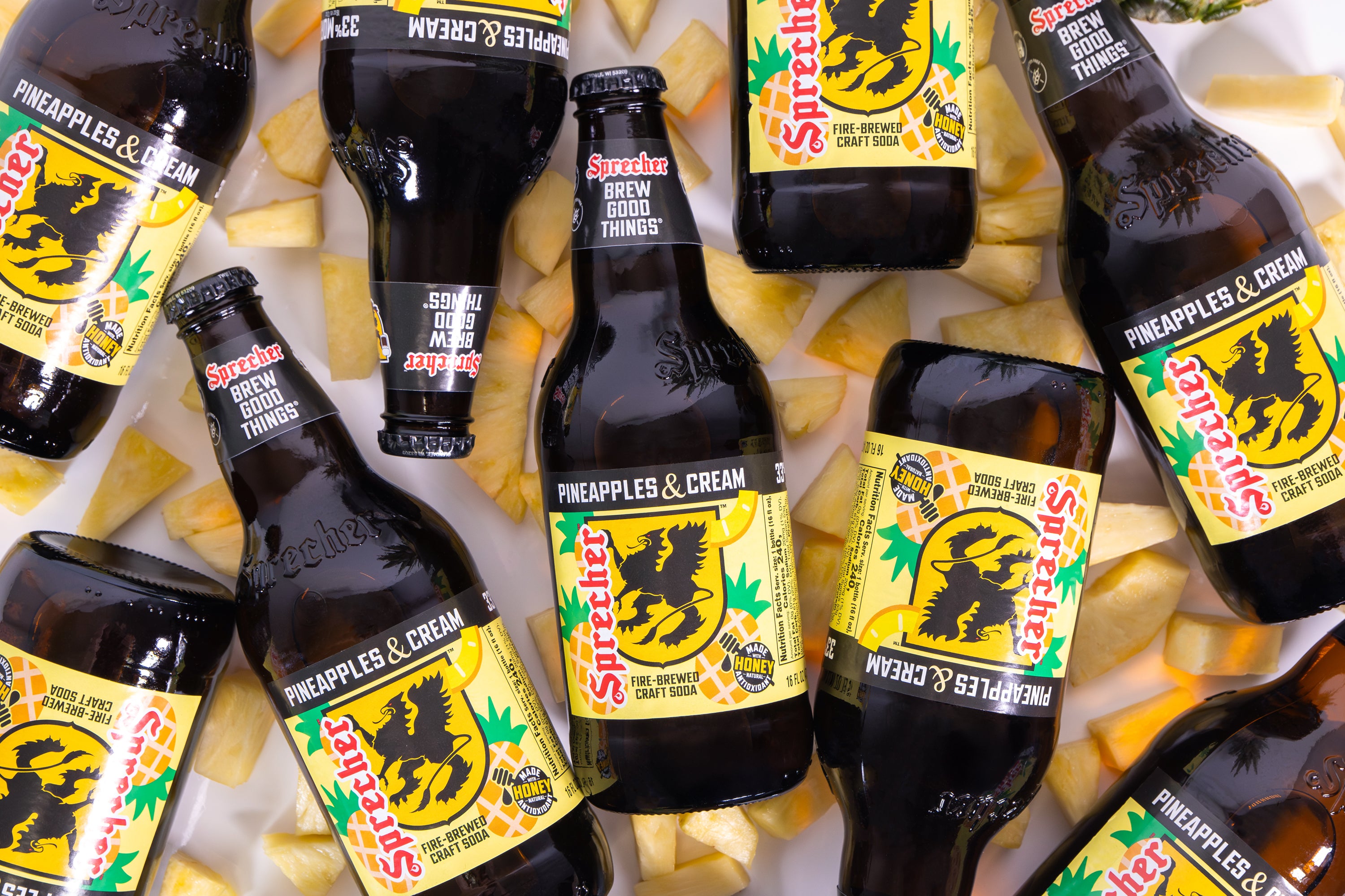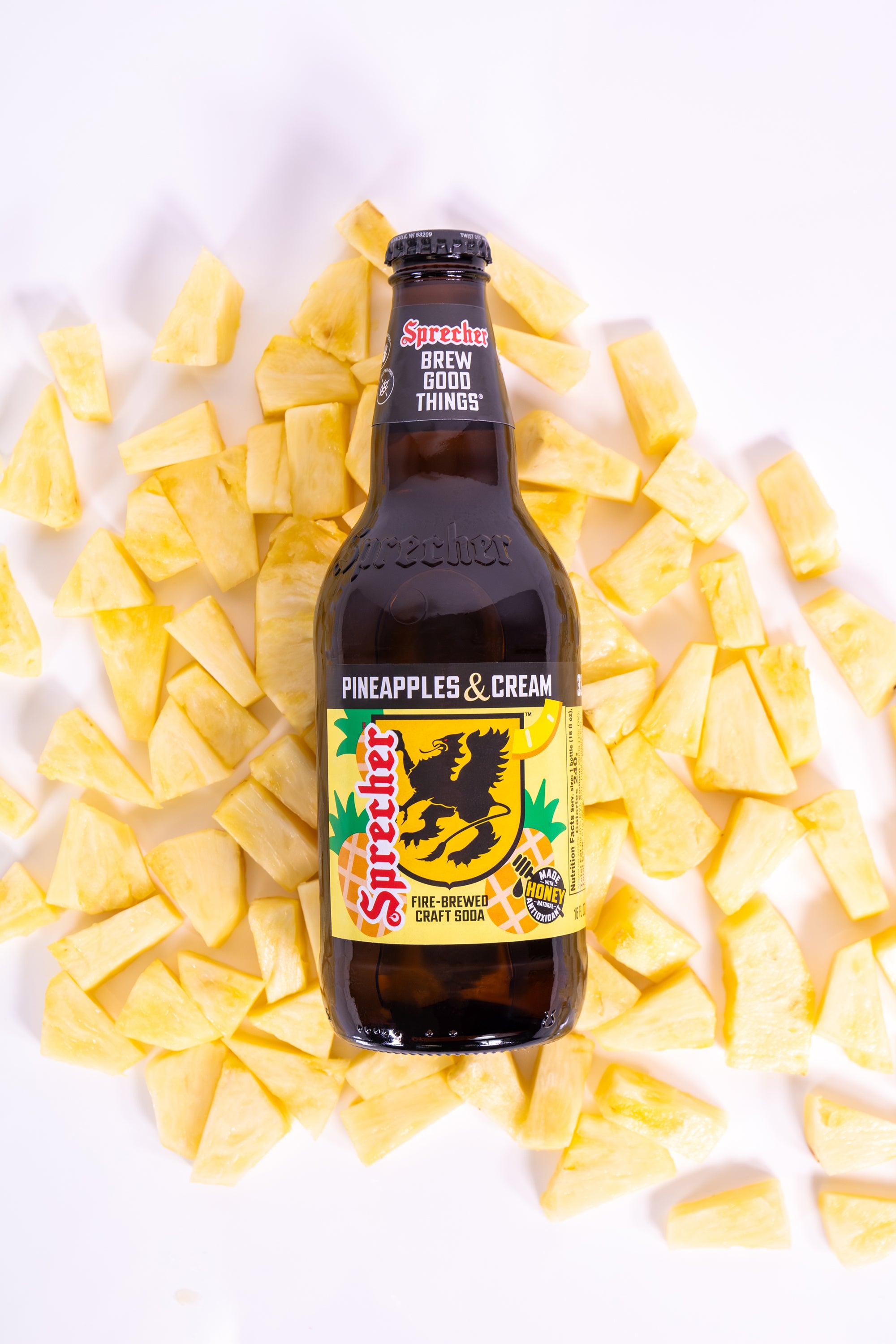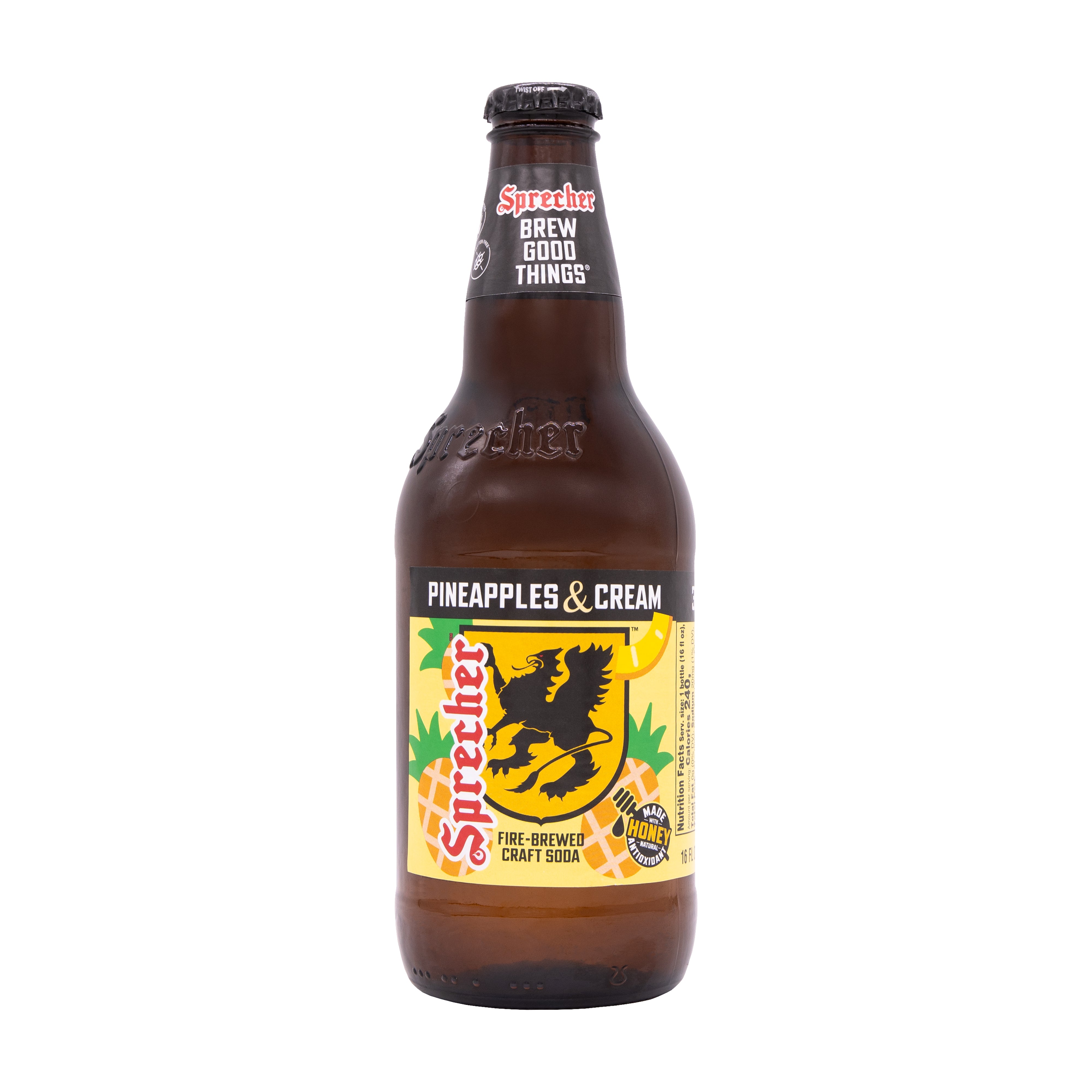 Made with real honey, Pineapples & Cream delivers natural sweetness that balances vibrant pineapple notes with a creamy, dessert like finish. The result is a bold yet smooth soda that is refreshing, indulgent, and unmistakably Sprecher.