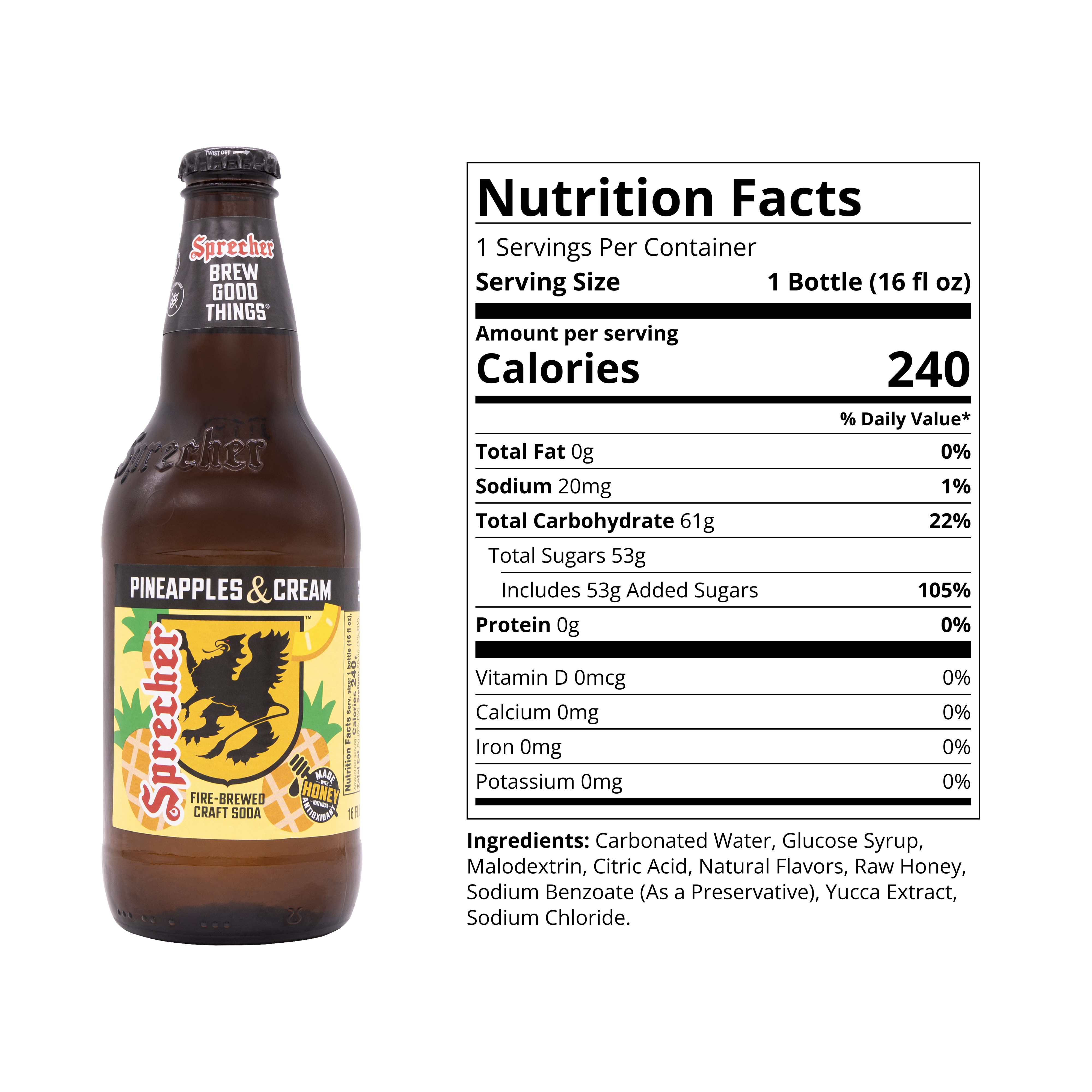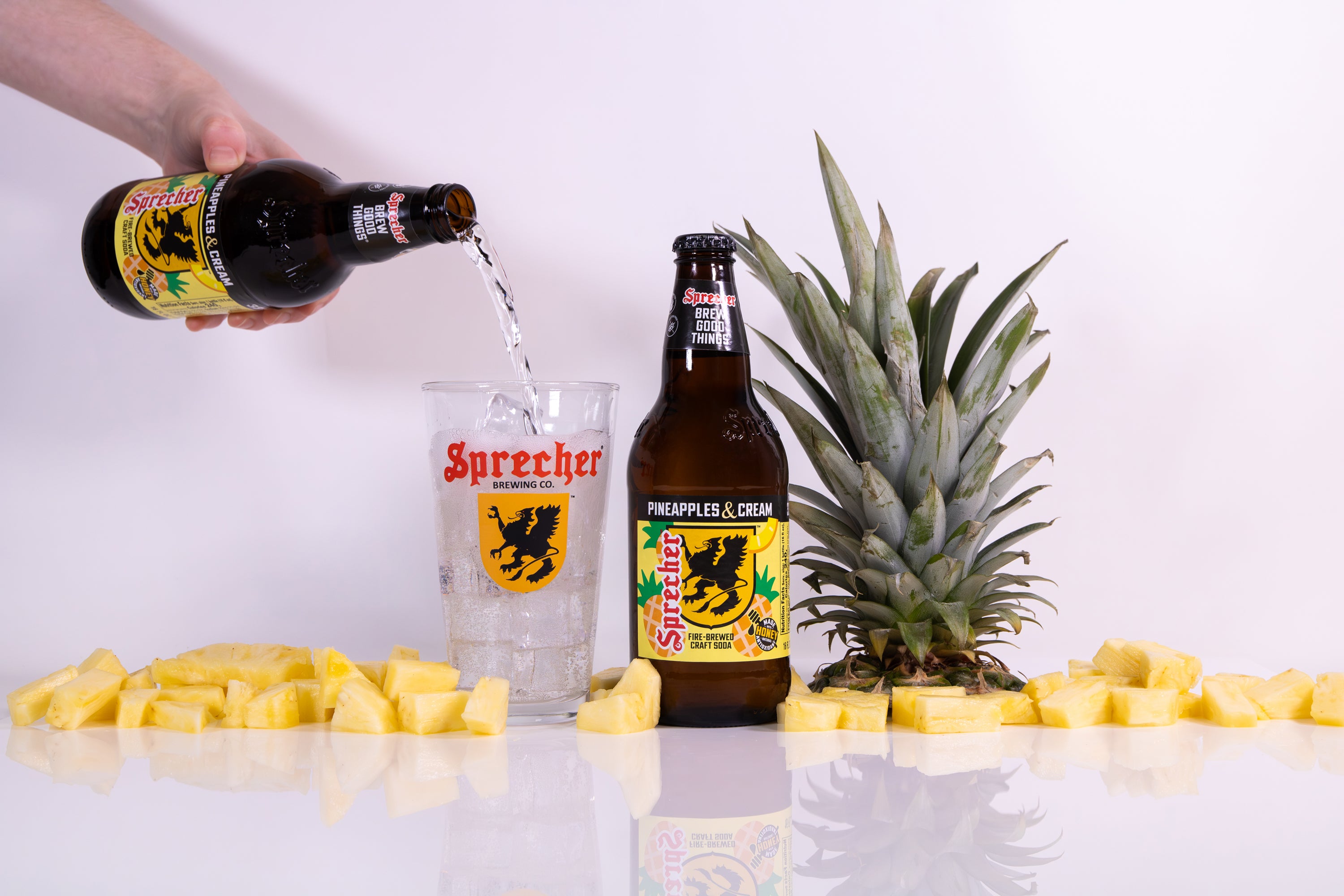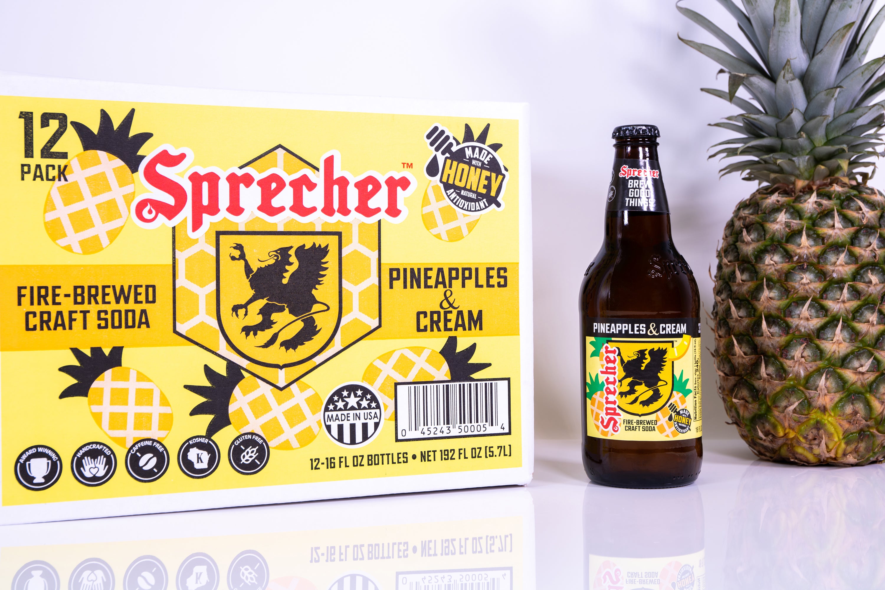 Made with real honey, Pineapples & Cream delivers natural sweetness that balances vibrant pineapple notes with a creamy, dessert like finish. The result is a bold yet smooth soda that is refreshing, indulgent, and unmistakably Sprecher.