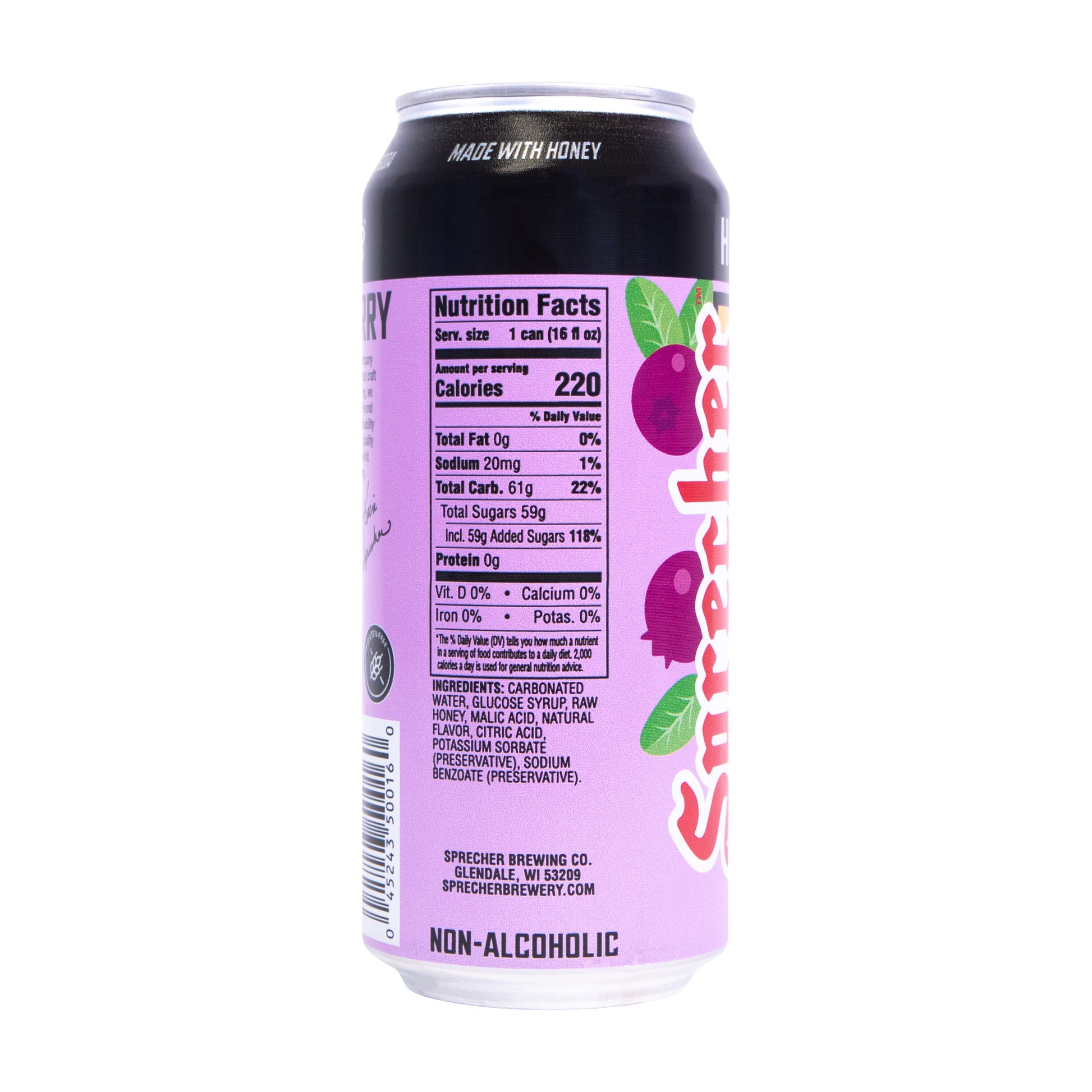 Sprecher Huckleberry is made with carbonated water, glucose syrup, raw honey, malic acid, natural flavor, and citric acid for balanced sweetness and brightness. Potassium sorbate and sodium benzoate are included to maintain freshness and preserve quality.