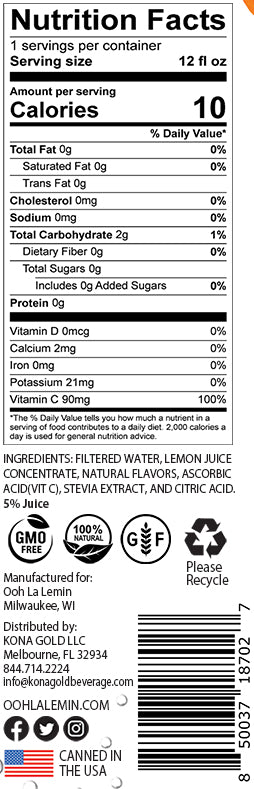 Each 12 fl oz can of Ooh La Lemin Sparkling Citrus Splash contains only 10 calories with 0g fat, 0mg sodium, 2g total carbohydrates, 0g sugar, and 0g protein, while delivering 100% of your daily vitamin C.